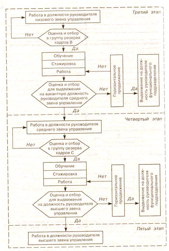 Третий этап — работа с линейными руководителями низового звена управления. На этом этапе к отобранным линейным руководителям низового звена (мастера, начальники участков) присоединяется также часть работников, окончивших вечерние и заочные вузы, успешно работающих в своих коллективах и прошедших тестирование. В течение всего периода (2—3 года) с данной группой проводится конкретная целенаправленная работа. Линейные руководители замещают отсутствующих руководителей, являются их дублерами, обучаются на курсах повышения квали^ фикации. После завершения этапа подготовки на основании анализа производственной деятельности каждого конкретного руководителя проводится вторичный отбор и тестирование. Успешно прошедшие второй отбор руководители предлагаются для выдвижения на вакантные должности начальников цехов, их заместителей, предварительно пройдя стажировку на этих должностях, или зачисляются в резерв и при появлении вакансий назначаются на должности. Остальные работники, прошедшие подготовку, продолжают работать на своих должностях; возможны их горизонтальные перемещения.