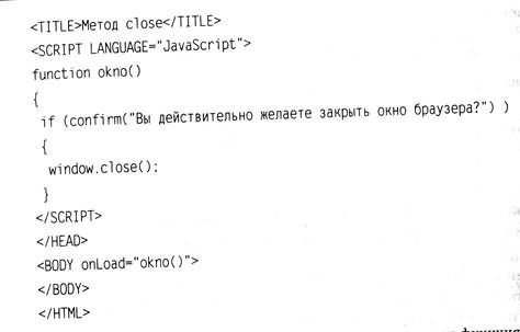 Если ответ будет положительным, то функция okno () для текущего объекта window вызовет метод close. В данном случае таким объектом является окно браузера. Метод close позволяет закрыть текущее окно браузера.