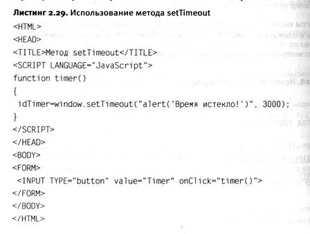 Листинг2-29 содержит сценарий и форму с кнопкой т'тег, при нажатии на которую открывается окно Alert с задержкой в 3 с (рис. 2.19).