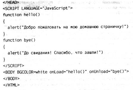 Здесь в операторе <BODY> мы определили обработчики событий onLoad и onUnloac. При возникновении первого события будет вызываться функция hello, а при возникновении второго — функция bye.