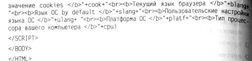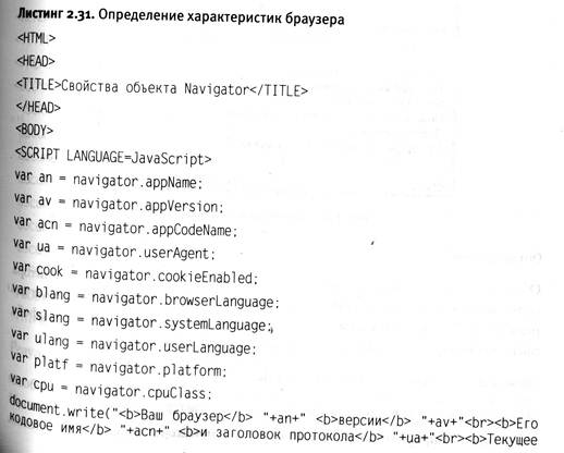 Рассмотрим пример сценария, в котором определяются различные характеристики браузера (листинг 2.31).