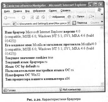В данном примере каждому свойству объекта Navigator назначается отдельная переменная. С помощью команды document.write информация о характеристиках браузера отображается на веб-странице (рис. 2.20).