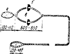 Конец Александрова (рис.10.1.) делают из пенькового троса длиной до 30 м, окружностью 10-25 мм. На одном конце находится петля длиной 600-650 или 900 мм, на которой закреплено два еловых или сосновых поплавка диаметром 100-110 мм. Они имеют форму плоских кругов, окрашенных в красный цвет. На конце петли крепят груз весом 250-300 г, представляющий собой хлопчатобумажный мешочек, набитый песком или мелкой крошкой и покрытый оплеткой из пенькового больного линя. На грузе делают малую петлю, с помощью которой его крепят к большой петле. На другой стороне конца делается петля меньших размеров, которая надевается на руку спасателя. При испытании на прочность трос должен выдерживать нагрузку не менее 130 кг.