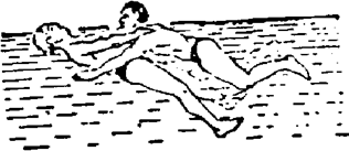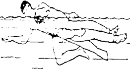 б) уставший пловец плывет на спине, а оказывающий помощь наплывает на него со стороны ног и кладет на свои плечи свободно выпрямленные руки уставшего человека, который широко раздвигает ноги, чтобы не мешать движению рук и ног спасателя, плывя способом брасс. спасатель толкает впереди себя уставшего человека так, чтобы рот и нос находились на поверхности воды (Рис.10.6.)