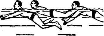 в) если помощь оказывают два спасателя, терпящий бедствие человек располагается между ними, положив выпрямленные ноги и руки на плечи спасателям. Оказывающие помощь плывут способ брасс. При этом ноги уставшего пловца должны быть расслабленными, чтобы не затруднять движения рук заднего пловца (Рис.10.7)