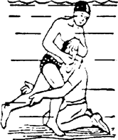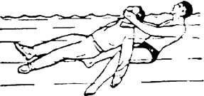 Захват под мышки. Оказывающий помощь крепко подхватывает пострадавшего под мышки, как показано на рис.10.10, и буксирует утопающего, плывя при помощи ног.