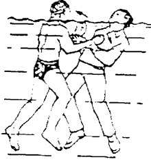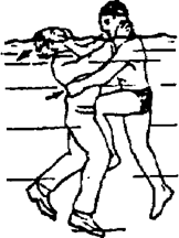 Освобождение от захвата за туловище под руки. При захвате тонущим спасателя за туловище под руки спасатель освобождается таким же приемом, как и при захвате за шею спереди.