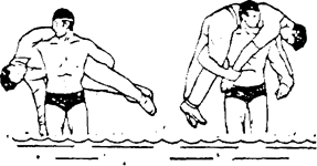 К тонущему человеку подплывают сзади. Если это сделать невозможно, то следует поднырнуть под пострадавшего, захватить левой рукой под колено его правой ноги, а ладонью правой руки сильно толкнуть левое колено спереди и повернуть тонущего к себе спиной. Делать это нужно в тех случаях, когда пострадавший в панике совершает беспорядочные движения или сопротивляется (рис10.8.).