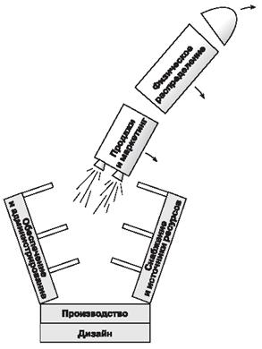 Организация представляет собой своеобразную ракету-носитель, которая разрабатывает, производит и запускает на рынок товары и услуги. Для того чтобы осуществить все это, она должна выполнить определенную последовательность бизнес-функций, которую М. Портер назвал «ценностной цепочкой». Как это хорошо видно на нашем рисунке, разработка (продукции или процесса) и производство являются основной платформой «стартового комплекса», в то время как снабжение и источники ресурсов (включая финансирование), с одной стороны, и системы администрирования и обеспечения (такие, как связи с общественностью и трудовые отношения) с другой, образуют башенные опоры. Ракета-носитель имеет две ступени (которые отделяются во время «полета» продукта): первая—это продажи и маркетинг, вторая— физическое распределение.