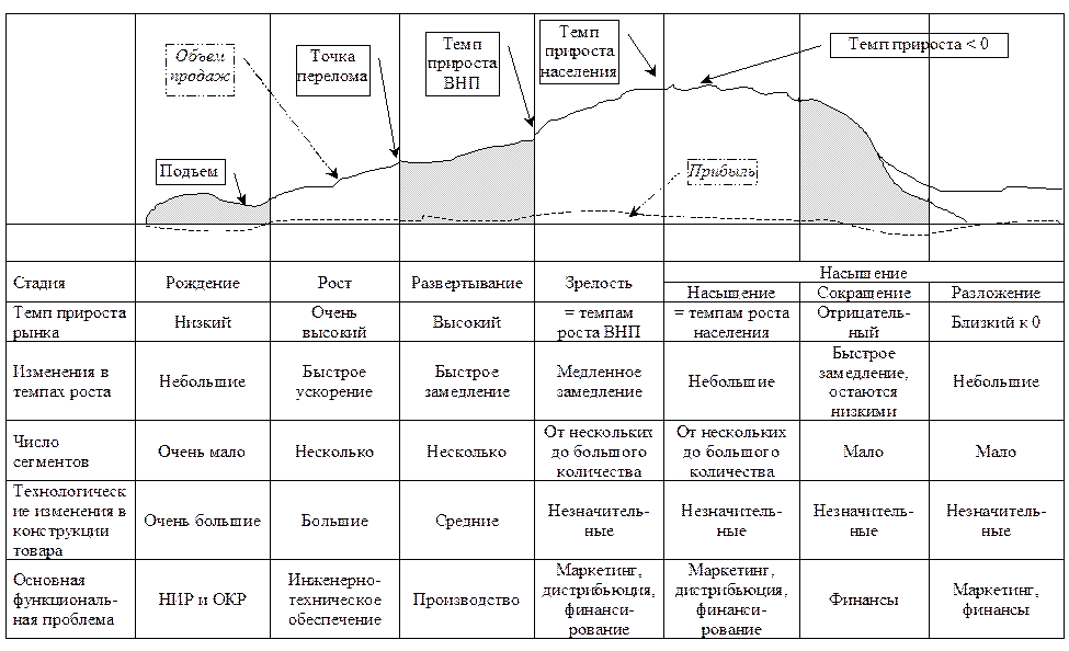 Для определения стадии жизненного цикла рынка в качестве отличительных Параметров могут быть использованы следующие 6 переменных: темпы роста рынка, темпы технологических изменений продукта, темпы технологических изменений процесса, изменения в росте рынка, сегментация рынка и функциональное значение. На рис.??? показано, каким образом значения параметров переменных характеризуют каждую стадию жизненного цикла. Подразумевается, что:
