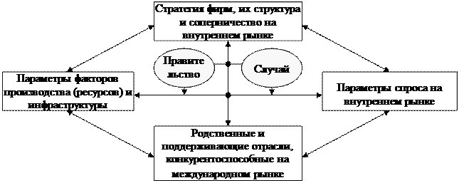 М. Портер приводит детерминанты конкурентного преимущества страны (рис. 9). Эти детерминанты, или национальный "ромб", — это система, компоненты которой взаимно усиливаются. Каждый детерминант влияет на все остальные. Кроме того, преимущества в одном детерминанте могут создать или усилить преимущества в других. Преимущество по каждому такому детерминанту не является показателем конкурентного преимущества в отрасли. Но взаимодействие преимуществ по всем детерминантам обеспечивает самоусиливающиеся выигрышные моменты, которые иностранным конкурентам очень трудно уничтожить или скопировать.