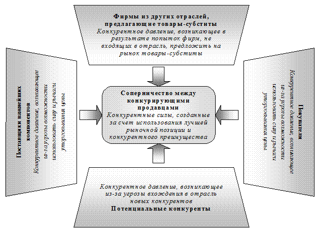 М. Портер отмечает, что стратегия должна основываться на всестороннем понимании структуры отрасли и процесса ее изменения. Несмотря на то, что влияние конкуренции в каждой отрасли различно, сам по себе характер конкуренции сходен, что позволяет использовать данную ниже схему для определения ее природы и степени воздействия конкурентных сил. В любой отрасли суть конкуренции выражается пятью силами (рис. 10).
