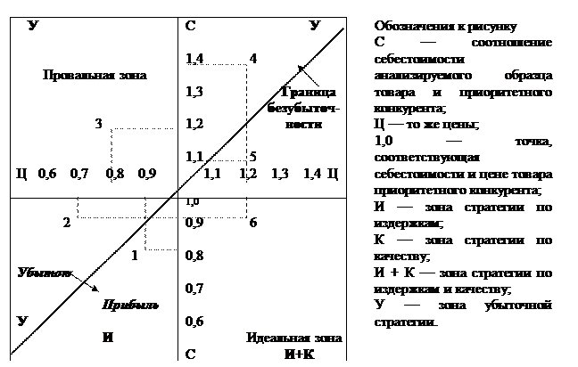 В точке "1" себестоимость товара фирмы на 20% ниже себестоимости товара приоритетного конкурента, цена ниже (значит, и качество ниже, поскольку цена в условиях конкуренции определяется рынком) на 10%. Значит, прибыль фирмы по данному товару по сравнению с конкурентом возрастет на 10% (20—10). В точке "2" себестоимость товара фирмы ниже себестоимости конкурента на 10%, а цена — на 30%, значит, прибыль фирмы по сравнению с прибылью конкурента будет меньше на 20% (30—10), фирма несет убыток. В точке "3" себестоимость товара фирмы выше на 20%, а цена ниже на 20%. Если принять, что цена пропорциональна качеству, то товар в точке "3" убыточен и по издержкам и по качеству. Однако на практике эта пропорция не всегда соблюдается, поэтому возможны варианты. В точке "5" цена (качество) выше на 20%, а себестоимость — на 10%, значит, дополнительная прибыль фирмы по сравнению с конкурентом составит 10%. В идеальной зоне, точке "6" фирма реализует стратегии и по издержкам (на 10% ниже) и по качеству (на 20% выше).