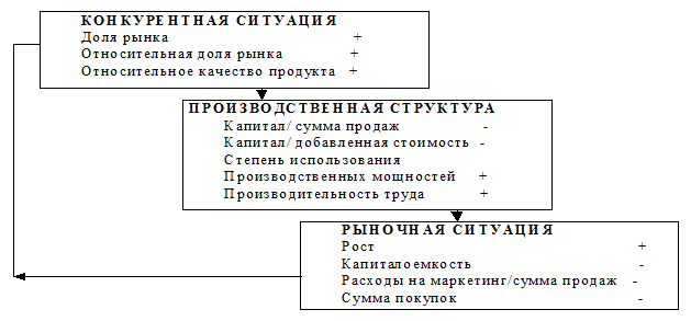 Решающие факторы прибыльности для любой отрасли в соответствии с моделью PIMS представлены на рис. 17. Эти факторы подразделяются на три группы: конкурентная ситуация, производственная структура, рыночная ситуация. На схеме знак «+» означает благоприятный эффект на прибыльность, а знак «-» означает неблагоприятный эффект. Факторы проранжированы.