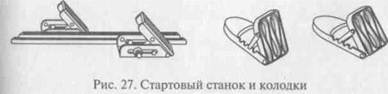 Старт. В беге на короткие дистанции, согласно правилам со-I ревнований, применяется низкий старт, используя при этом стар-I товые колодки (станки) (рис. 27).