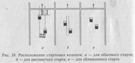 При сближенном старте расстояние от стартовой линии до первой колодки — 1,5 стопы, от первой до второй — 1 стопа.