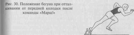 I сзади стоящей ногой начинается отталкивание от колодки впереди стоящей ноги, которая резко разгибается во всех суставах (рис. 30). Обычно руки работают разноименно, но некоторые тренеры предлагают начинать движения руками одноименно и с час-