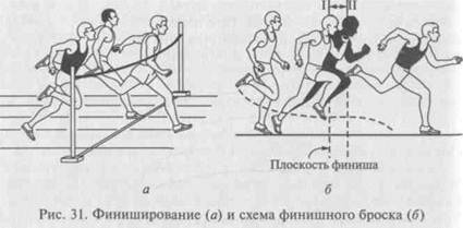 Бег на дистанции заканчивается в момент, когда бегун касается створа финиша, т. е. воображаемой вертикальной плоскости, проходящей через линию финиша. Чтобы быстрее ее коснуться, бегуны на последнем шаге делают резкий наклон туловища вперед с отведением рук назад. Этот способ называют «бросок грудью» (рис. 31).