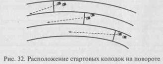 В беге на 200 м имеются некоторые технические особенности, отличные от техники бега на 100 м. Спортсмены стартуют с виража и первую половину дистанции бегут по повороту дорожки. Колодки ставятся у внешнего края дорожки по касательной к изгибу внутренней линии дорожки, чтобы выполнять первый отрезок стартового разгона по прямой (рис. 32).