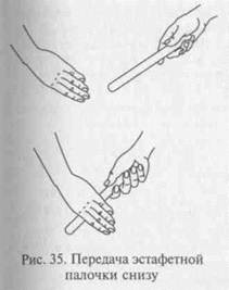 Существуют два способа передачи эстафетной палочки: снизу — вверх и сверху—вниз. При первом способе бегун, принимающий эстафетную палочку, отводит руку (противоположную руке передающего бегуна) назад чуть в сторону, большой палец отводится в сторону плоскости ладони, четыре пальца сомкнуты, ладонь смотрит прямо назад. Передающий бегун вкладывает эстафетную палочку движением снизу —вверх между большим пальцем и ладонью. Почувствовав прикосновение эстафетной палочки, принимающий бегун захватывает ее, сжимая кисть (рис. 35).