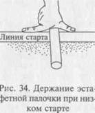 Рассмотрим технику эстафетного бега 4 х 100 м. На I этапе бегун стартует с низкого старта в вираж, как при старте на 200 м. Эстафетная палочка держится тремя пальцами правой руки, а указательный и большой пальцы выпрямлены и упираются в дорожку у стартовой линии (рис. 34). Для того чтобы бегун I этапа бежал у бровки дорожки, он должен всегда держать палочку в правой руке, а передавать в левую руку своему партнеру. Бег по дистанции осуществляется с максимальной скоростью. Сложность заключается в передаче эстафетной палочки в ограниченной зоне на высокой скорости.