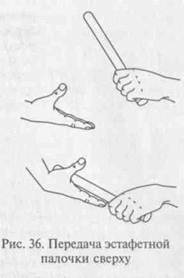 При втором способе рука отводится также назад чуть в сторону, но плоскость ладони смотрит вверх. Передающий бегун вкладывает эстафетную палочку движением сверху—вниз, опуская ее на ладонь. При соприкосновении палочки с ладонью принимающий бегун захватывает ее, сжимая кисть (рис. 36).