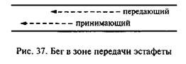 В зоне передачи бегуны должны бежать, не мешая друг другу, т.е. по краям беговой дорожки в зависимости от руки, осуществляющей передачу (рис. 37).