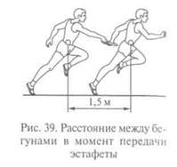 Расстояние между бегунами в момент передачи равняется длине отведенной назад руки бегуна, принимающего эстафету, и длине выпрямленной вперед руки бегуна, передающего эстафету. Это расстояние может несколько увеличиться за счет наклона вперед при передаче передающего бегуна (рис. 39). Такое расстояние может быть выдержано только при рациональной технике передачи эстафеты на соответствующей скорости бега. Если расстояние сокращается, то возможен обгон принимающего бегуна передающим, и наоборот, при увеличении расстояния между бегунами передача может не состояться или будет выполнена вне коридора.