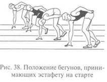 При рациональной технике передачи эстафеты бегун, принимающий палочку, должен осуществлять бег и прием эстафеты не оглядываясь назад, сохраняя высокую скорость. Обычно бегун, принимающий эстафету, стартует или с высокого старта, или с низкого старта с опорой на одну руку. При высоком старте бегун поворачивает голову немного назад, чтобы видеть контрольную отметку и подбегающего к ней бегуна. При старте с опорой на одну РУку бегун смотрит назад через плечо неопорной руки, или, опустив голову, смотрит назад под неопорной рукой (рис. 38).