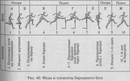 Преодоление барьера условно имеет три этапа: 1) атака барьера; 2) переход через барьер; 3) сход с барьера. Атака барьера начинается с движения маховой ноги после прохождения вертикали. Движение начинается бедром, голень согнута в коленном суставе, как в обычном беговом шаге. Далее бедро движется вверх —вперед до горизонтали, голень выпрямляется вперед, атакуя барьер пяткой. Барьерист принимает положение «шпагата» на опоре. Одновременно с движением маховой ноги туловище делает наклон вперед, противоположная маховой ноге рука также посылается вперед к носку маховой ноги. Движения туловища, руки, маховой ноги должны быть быстрыми и совпадать по ритму. Взгляд спортсмена направлен вперед. После отрыва толчковой ноги от опоры начинается следующая фаза — переход через барьер (рис. 40).