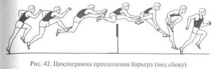 Сход с барьера. Высокотехничный барьерист ставит маховую ногу на опору после преодоления барьера с носка, не опускаясь на пятку. Маховая нога выпрямлена в коленном суставе, толчковая нога идет бедром вперед—чуть вверх, угол в коленном суставе между бедром и голенью увеличивается до 90 градусов и более. Атлет делает первый шаг после схода с барьера с высокого уровня ОЦМ. Расстояние от барьера до постановки маховой ноги крлеб-лется от 130 — 160 см. Наклон туловища должен сохраняться как при начале атаки барьера. Отведение туловища назад при сходе с барьера является грубейшей ошибкой в технике преодоления барьера (рис. 42).