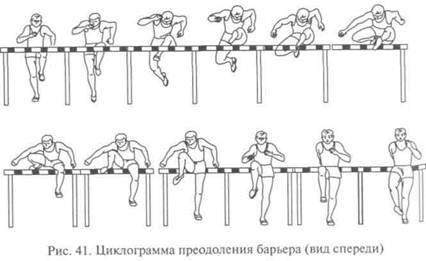 кается постепенно вниз. Толчковая нога после отрыва от грунта сгибается в коленном суставе, бедро отводится в сторону в тазобедренном суставе, голеностопный сустав разгибается полностью. Бедро должно быть выше, чем голень и пятка. В этом положении согнутая нога выполняет движение вперед через сторону. Маховая рука, полусогнутая в локтевом суставе, отведена назад. В момент прохождения вертикали над барьером, когда бедро толчковой ноги начинает движение вперед, руки встречаются у туловища. Движение руки, противоположное маховой ноге, напоминает «загребающее» движение назад через сторону, другая рука выполняет обычное движение как в гладком беге. Когда маховая нога касается опоры за барьером, начинается завершающая фаза преодоления барьера (рис. 41).