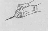Держание молота. Для того чтобы не получить травму кисти, метателю разрешается надевать перчатку на руку. Он держит ручку молота на средних фалангах четырех пальцев, другая рука кладется сверху, закрывая кисть, большой палец этой руки прижимается к кисти нижней руки, а большой палец нижней руки кладется поверх этого пальца (рис. 79).