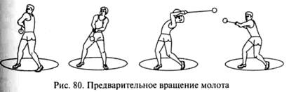 ПОД углом к горизонту в 30 — 40°. Когда молот приближается к левому плечу, начинается сгибание рук в локтевых суставах, сначала левого, затем правого. Над головой руки проходят в согнутом положении. В момент прохождения молотом правого плеча происходит их разгибание, сначала левой, затем правой руки. Перед грудью руки выпрямлены, туловище отклонено назад. Предварительное вращение следует выполнять свободно, без лишнего мышечного напряжения. При выполнении вращения и создании оптимального условия для начала поворотов большую роль играет перемещение метателя (в основном таза) в сторону, противоположную действию центробежной силы молота (рис. 80).