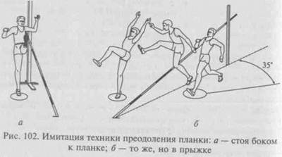 Во время совершенствования техники прыжка в целом необходимо постепенно поднимать планку, увеличивать скорость разбега и повышать эффективность ритмо-темповой структуры последних шагов разбега. На этом этапе полезно использовать метод поочередного сосредоточения внимания на отдельных элементах техники при выполнении прыжка в целом. Во время совершенствования нужно чаще применять имитационные упражнения, сходные по структуре изучаемого прыжка (рис. 104).