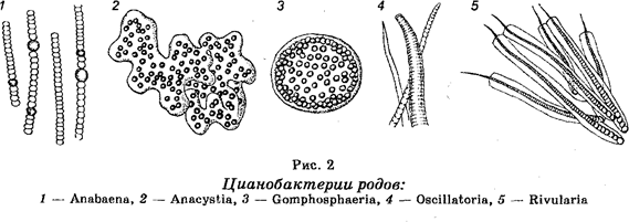 Отдел Цианобактерии (Cyanobacteria). Строение цианобакте-рий (по старой ботанической терминологии — сине-зеленых водорослей) до некоторой степени сходно со строением бактерий (рис. 2). Известно около 2500 видов. В основном они являются одноклеточными организмами разной формы (округлой, цилиндрической), но могут образовывать длинные многоклеточные нити или даже объединяться в колонии. Однако они отличаются от настоящих бактерий тем, что их клеточные стенки содержат некоторое количество целлюлозы и что они способны к фотосинтезу, т. к. в цитоплазме содержат хлорофилл (в гранулах, но не в хлоропластах) и другие пигменты (каротин, ксантофил и фикобилины), создающие их окраску. Некоторые клетки в многоклеточных цианобактериях обладают способностью фиксировать азот атмосферы.