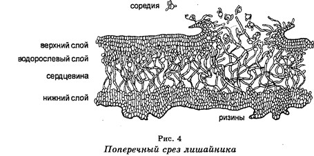 Лишайники представляют собой сложные организмы, образованные в результате симбиоза между грибами, водорослями зелеными, или цианобактериями, и азотобактером (рис. 4). Следовательно, лишайник — это комбинированный организм, т. е. гриб + водоросль + азотобактер, существование которого обеспечивается тем, что гифы гриба ответственны за поглощение воды и минеральных веществ, водоросль — за фотосинтез, а азотобактер — за фиксацию азота атмосферы. Лишайники являются обитателями всех ботанико-географических зон. Размножаются вегетативным, бесполым и половым путем.
