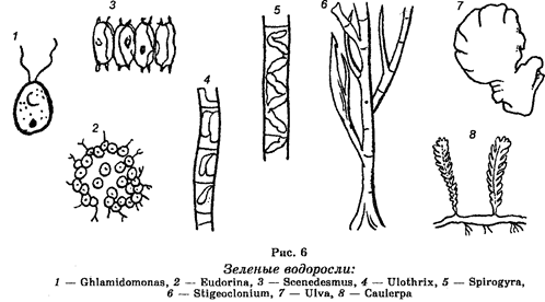 Отдел Зеленые водоросли (Chlorophyta). Этот отдел представлен подвижными и неподвижными одноклеточными и многоклеточными организмами, обладающими довольно толстой клеточной стенкой и имеющими форму нитей, трубочек (рис. 6). Некоторые виды формируют подвижные и неподвижные колонии. Насчитывают свыше 13 000 видов этих водорослей, большинство которых является обитателями пресных водоемов. Но известны и морские формы.