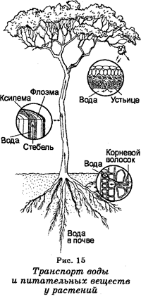 Корень является органом растения, который адсорбирует воду и минеральные вещества из почвы и проводит их к стеблю. У покрытосеменных, как и голосеменных, вода и питательные вещества из почвы адсорбируются корневыми волосками и проводятся в ксилему в результате осмотического давления в корневой системе, действия капилляров, отрицательного давления в ксилеме, доходящего иногда у некоторых древесных форм до 100 бар, и транспирации, т. е. испарения воды из листьев (рис. 15).