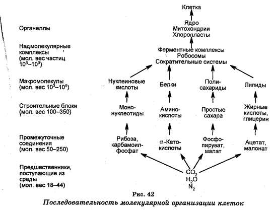 Биологические молекулы синтезируются из низкомолекулярных предшественников, которыми являются окись углерода, вода и атмосферный азот и которые в процессе метаболизма превращаются через промежуточные соединения возрастающей молекулярной массы (строительные блоки) в биологические макромолекулы с большой молекулярной массой (рис. 42). На этом уровне начинаются и осуществляются важнейшие процессы жизнедеятельности (кодирование и передача наследственной информации, дыхание, обмен веществ и энергии, изменчивость и др.).