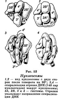 Количество ДНК и гистонов в хроматине эквивалентно. Будучи специфически связанными с ДНК, гистоны принимают участие в формировании основных структурных субъединиц хроматина (хромосом) — нуклеосом (рис. 53), которые являются элементарными единицами организации хроматина. Каждая нуклеосома представлена сегментом ДНК диаметром около 30 нм и длиной 146-240 пар оснований, намотанной 1,8 раз вокруг гистонового стержня, состоящего из пары гистонов. Нуклеосома закручена в сложную нить 2 раза при участии гистона HI в качестве кросслинкера, что дает структуру с упаковочным отношением 25:1, близким к интерфазному хроматину. Чтобы сформировалась митотическая хромосома из нити длиной 30 нм, необходима дальнейшая компактизация с помощью специфических негистоновых белков, приводящая к формированию скелета хромосомы. Установлено, что нуклеосомы являются репрессорами инициации транскрипции в эукариотических клетках. Нарушение структуры нуклеосом ведет к освобождению транскрипции от репрессии.