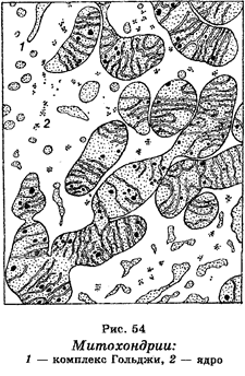 д) Митохондрии присутствуют во всех клетках организмов, которые используют для дыхания кислород. В одной клетке может находиться 50-5000 митохондрий. Они имеют форму палочек, нитей или гранул (рис. 54), а их размеры достигают 7 мкм.