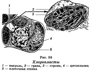 Для хлоропластов характерно мембранное строение (рис. 55). Встречаясь в клетках в количестве около 40 экземпляров на клетку, они имеют своеобразную форму двояковыпуклых линз и размеры