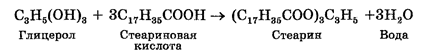 Липиды (от греч. lipos — жир), или жиры являются соединениями, состоящими из жирных кислот и глицерола. К этим липидам относят также жироподобные вещества (воска). Жирные кислоты — это органические кислоты. Наиболее встречаемыми жирными кислотами в жирах животных и растений являются пальмитиновая (CH3(CH2)15COOH), стеариновая (CH3(СH2)16COOH) и олеиновая (СН3-СН2)7СН-СН(СН2)7-СООН) жирные кислоты. Одна молекула глицерола и три молекулы жирной кислоты образуют одну молекулу липида и три молекулы воды. Например, стеарин образуется в результате реакции между одной молекулой глицерола и тремя молекулами стеариновой кислоты: