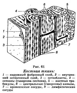 Костная ткань формирует скелет организма. Она состоит из костных клеток (остеоцитов, остеобластов и остеокластов) и выделяемого ими основного вещества кости, содержащего белки, из которых преобладающим является коллаген, и соли кальция (рис. 61).
