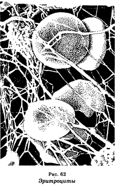 Эритроциты, или красные кровяные тельца (шарики), представляют собой безъядерные овальные клетки, диаметр которых составляет 7,1-7,9 мкм (рис. 62). 1 мл крови мужчины содержит 3,9— 5,5 х 109 эритроцитов, а 1 мл крови женщины — 3,7—4,9 х 109. Основной функцией эритроцитов является транспортировка кислорода и углекислоты.