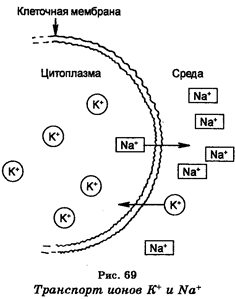 Активный транспорт особенно эффективен в случае переноса ионов. Реакции, обеспечивающие активный транспорт, происходят в мембране и сопряжены с реакциями, дающими свободную энергию. Ферменты, катализирующие эти реакции, также локализованы в мембране. Примером активного транспорта веществ является транспорт ионов натрия и калия (рис. 69), который определяет клеточный мембранный потенциал. Концентрация ионов натрия (Na+) внутри большинства клеток является меньшей, чем в среде, тогда как концентрация ионов калия (К+) внутри клеток является в 10—20 раз большей, чем в среде. В результате этого ионы Nа+ стремятся проникнуть из среды в клетку, а ионы К+, наоборот, выйти из клетки в среду. Поддержание концентрации этих ионов в клетке и в окружающей среде обеспечивается благодаря наличию в клеточной мембране системы, которая является ионным «насосом» и которая откачивает ионы Na+ из клетки в среду и накачивает ионы К+ в клетку из среды. Работа этой системы, т.е. движение ионов против электрохимического градиента, обеспечивается энергией, которая генерируется гидролизом АТФ, причем фермент АТФ-аза, катализирующий эту реакцию, содержится в самой мембране и, как считают, выполняет роль натриево-калиевого «насоса», генерирующего мембранный потенциал. Энергия, освобождаемая при гидролизе одной молекулы АТФ, обеспечивает транспорт за пределы клетки трех ионов Na+ и внутрь клетки двух ионов К+.