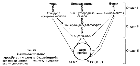 Больше того, между биосинтезом и деградацией химических соединений наблюдается взаимодействие, причем это взаимодействие обеспечивается АТФ (рис. 76).