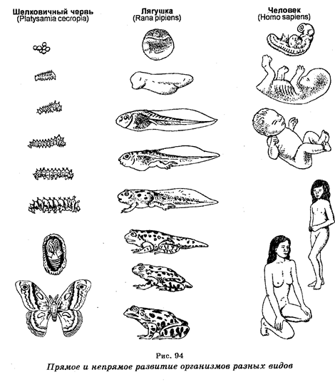 В случае организмов, для которых характерно прямое развитие (многие беспозвоночные, рыбы, пресмыкающиеся, птицы, млекопитающие, человек), вылупившиеся из яйцевых оболочек или новорожденные сходны со взрослыми формами, отличаясь от последних лишь меньшими размерами, а также недоразвитием отдельных органов и несовершенными пропорциями тела (рис. 94).