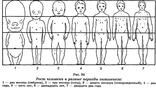 Характерной особенностью роста в ювенильный период организмов, подверженных прямому развитию, является то, что происходит увеличение количества и размеров клеток, изменяются пропорции тела. Рост человека в разные периоды его онтогенеза показан на рис. 95. Рост разных органов человека неравномерен. Например, рост головы заканчивается в детстве, ноги достигают пропорциональной величины примерно к 10 годам. Наружные половые органы очень быстро растут в возрасте 12—14 лет. Различают определенный и неопределенный рост. Определенный рост характерен для организмов, которые к определенному возрасту прекращают свой рост, например, насекомые, млекопитающие, человек. Неопределенный рост характерен для организмов, которые растут всю жизнь, например, моллюски, рыбы, земноводные, рептилии, многие виды растений.